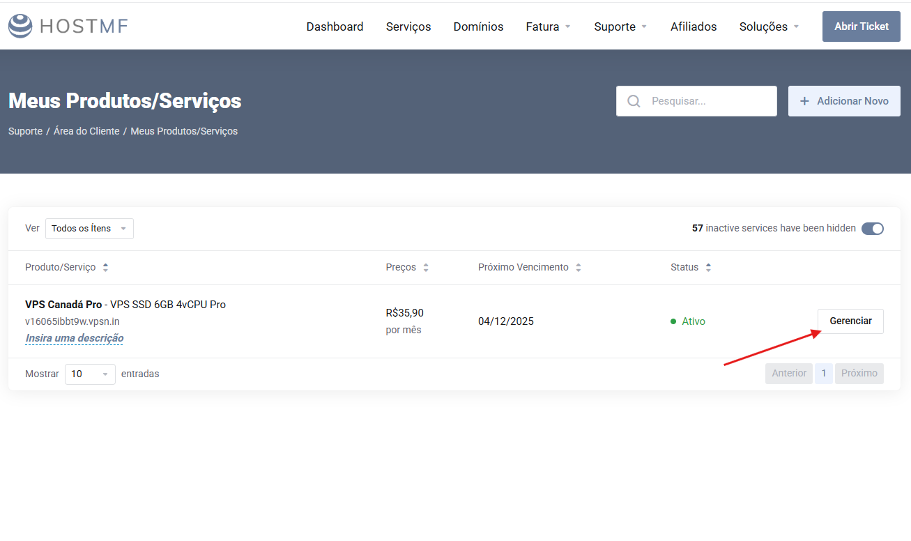 2. Localize o plano de VPS que você deseja se conectar e clique em "Gerenciar".